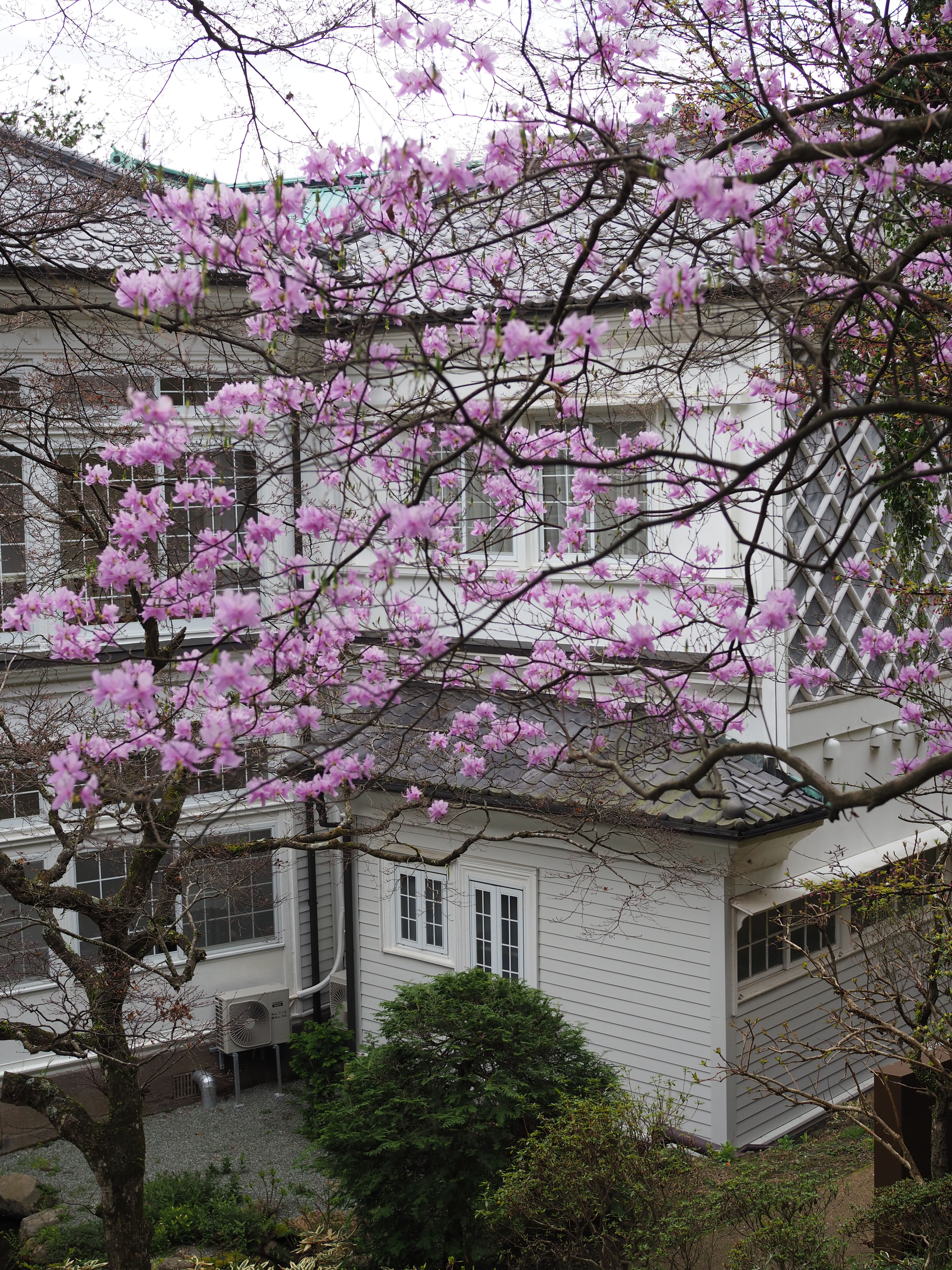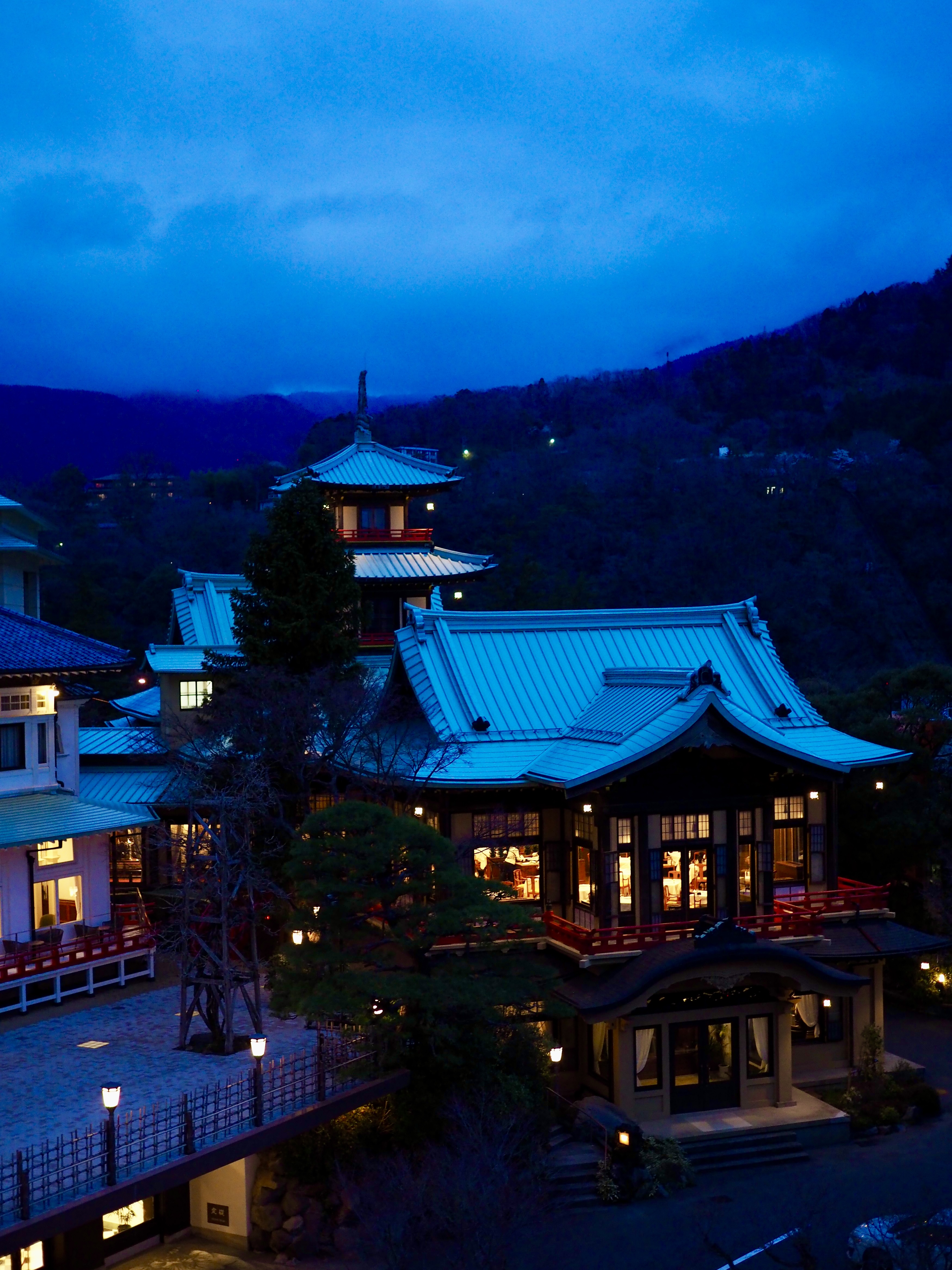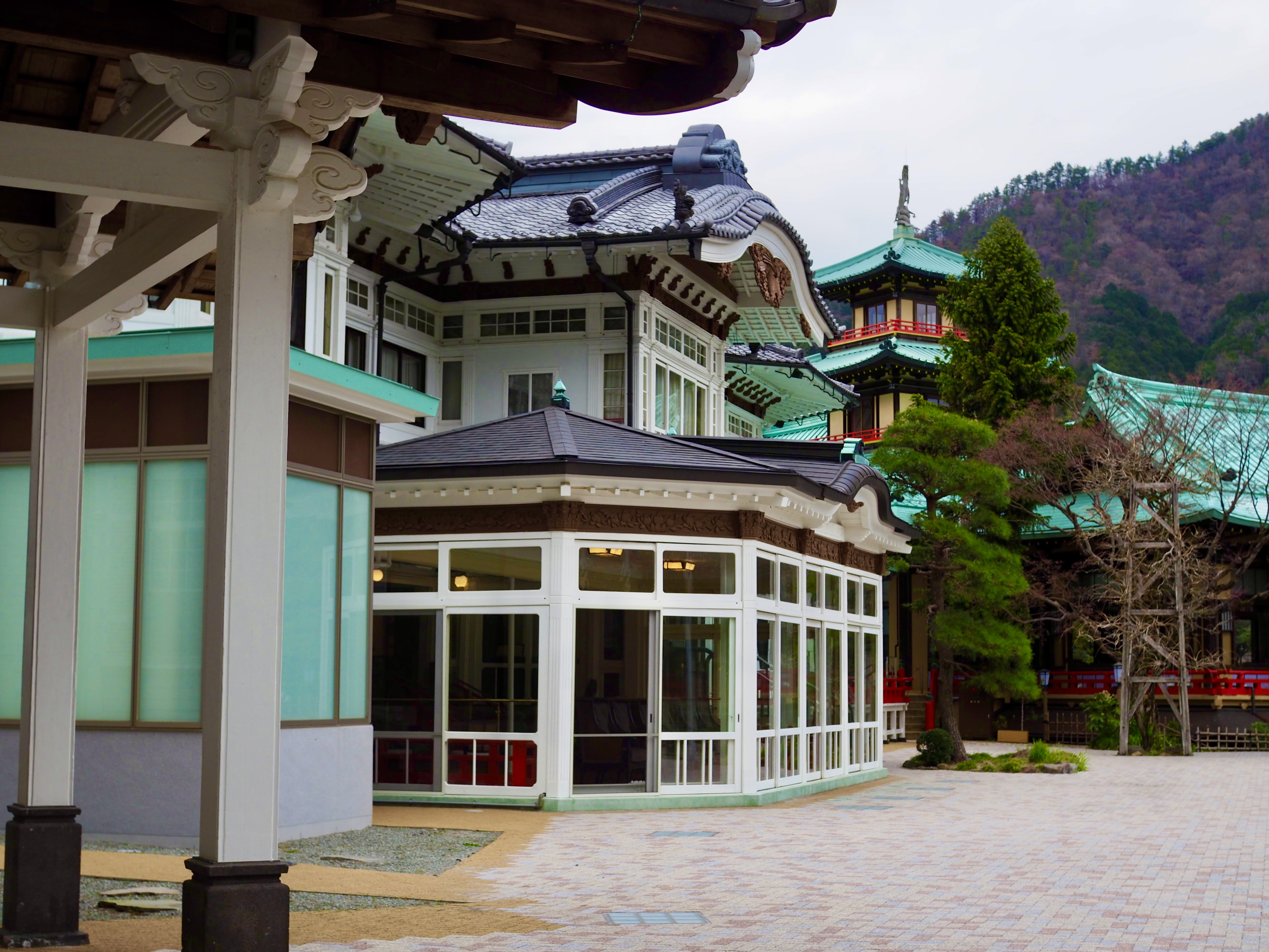 部屋から眺める明治建築の本館や西洋館、その背後の箱根の山々・・・もう絶景~
