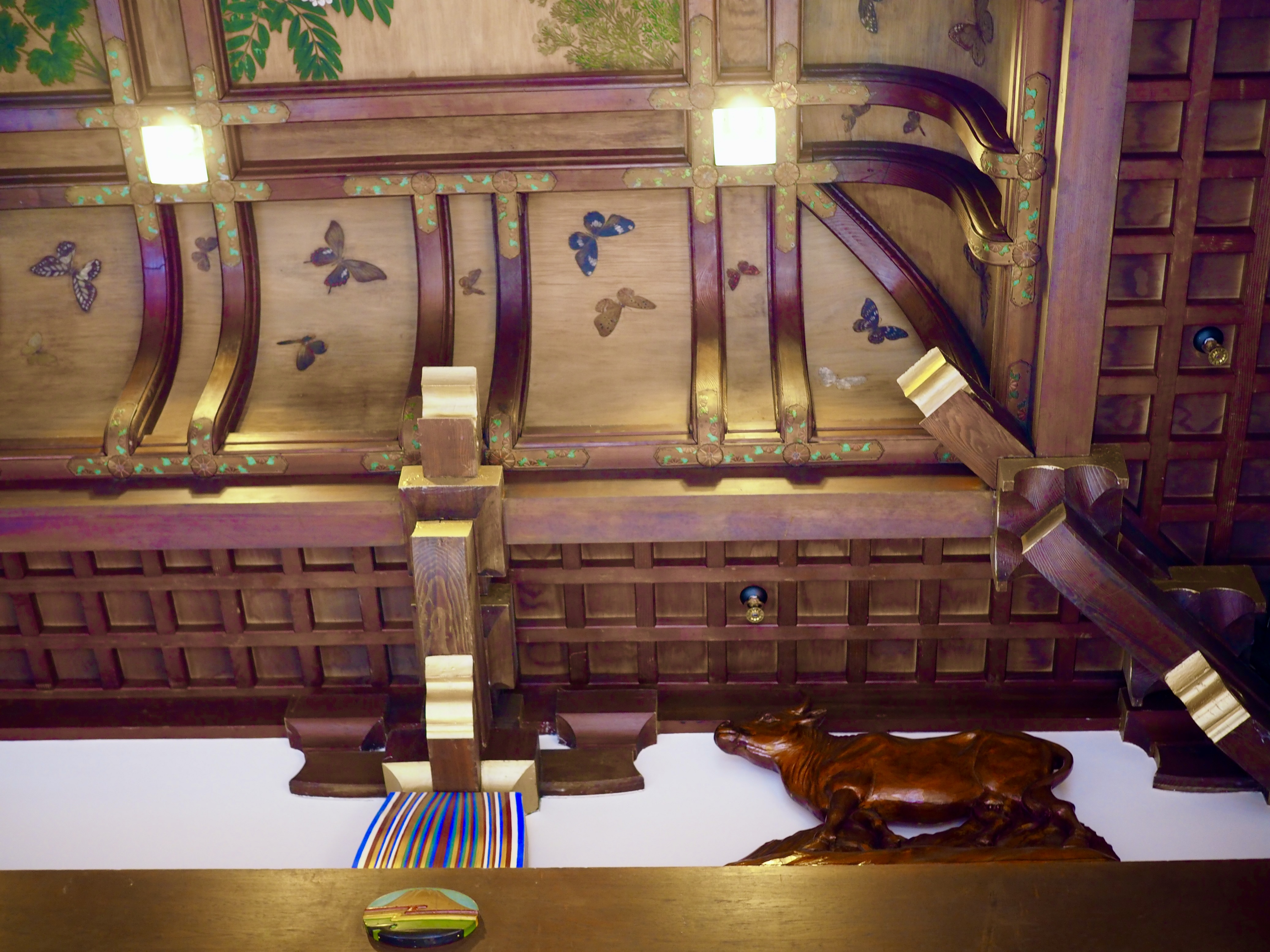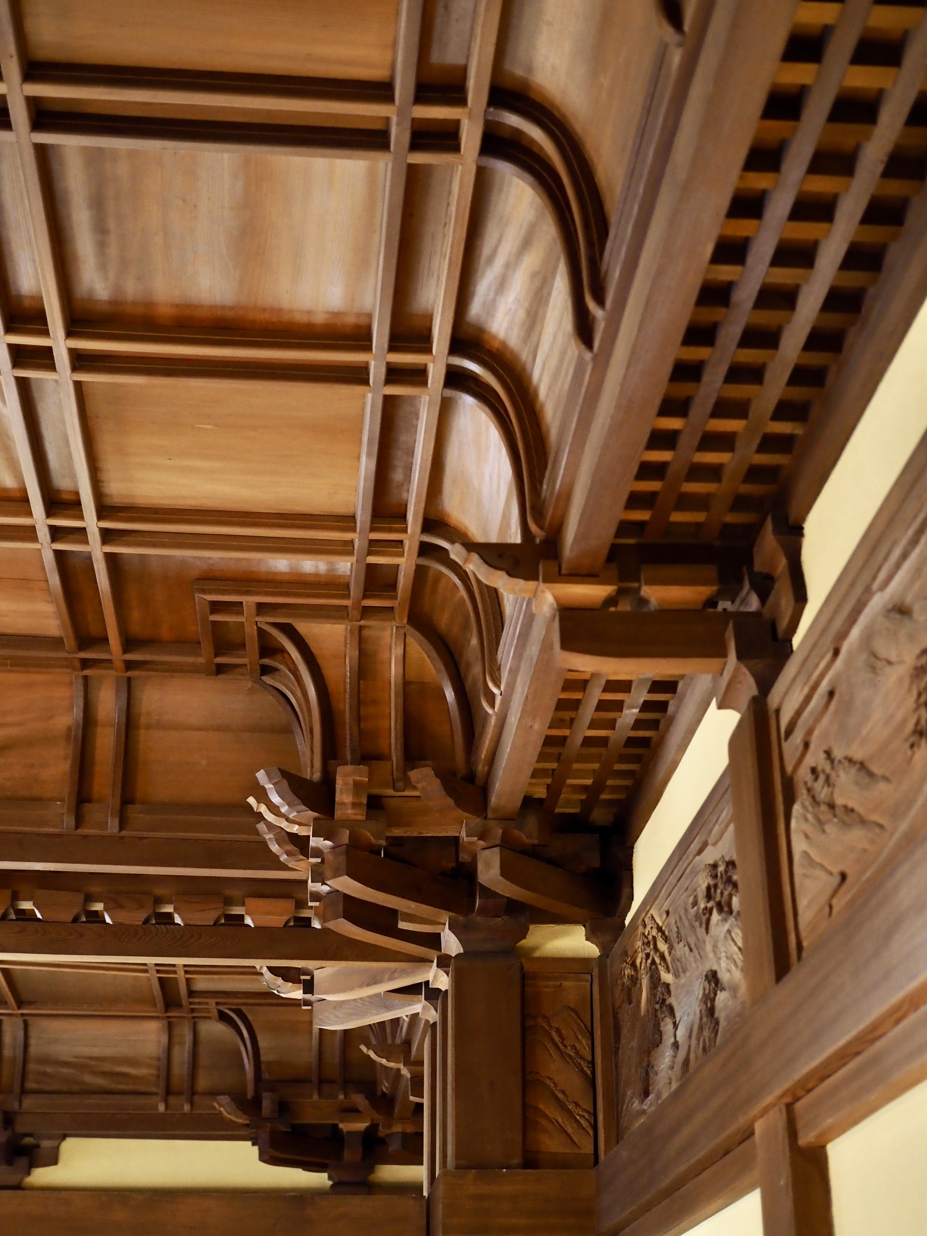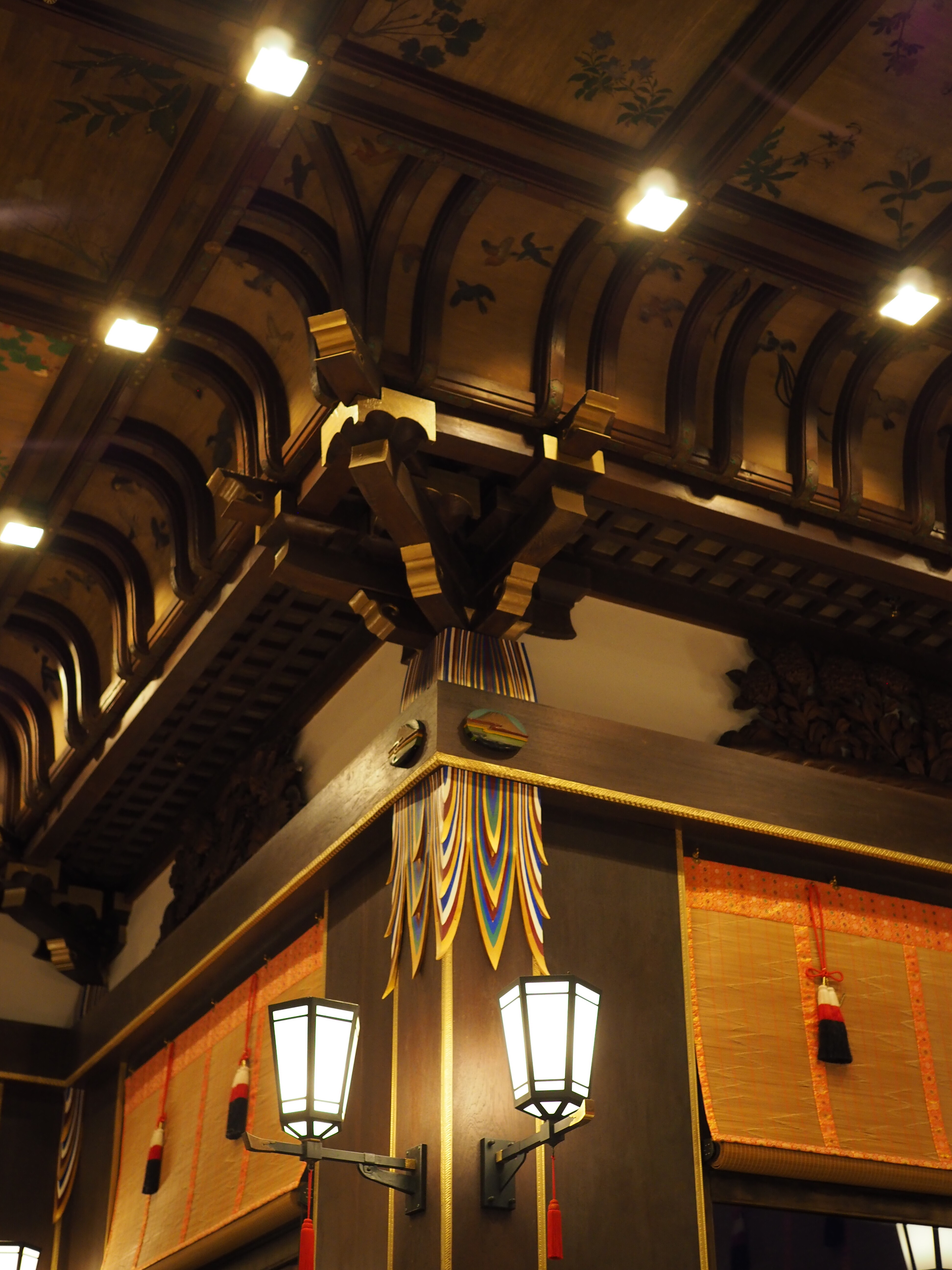 織り上げ格天井を始めとする、まるで神社仏閣で使われるような和の意匠を施されたスーパーな場所。