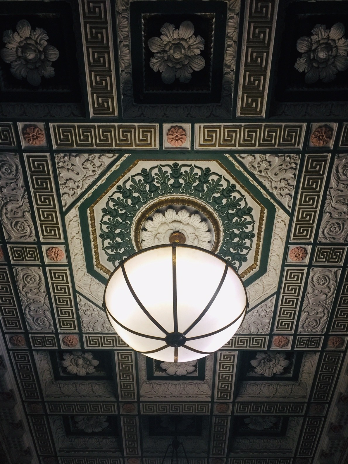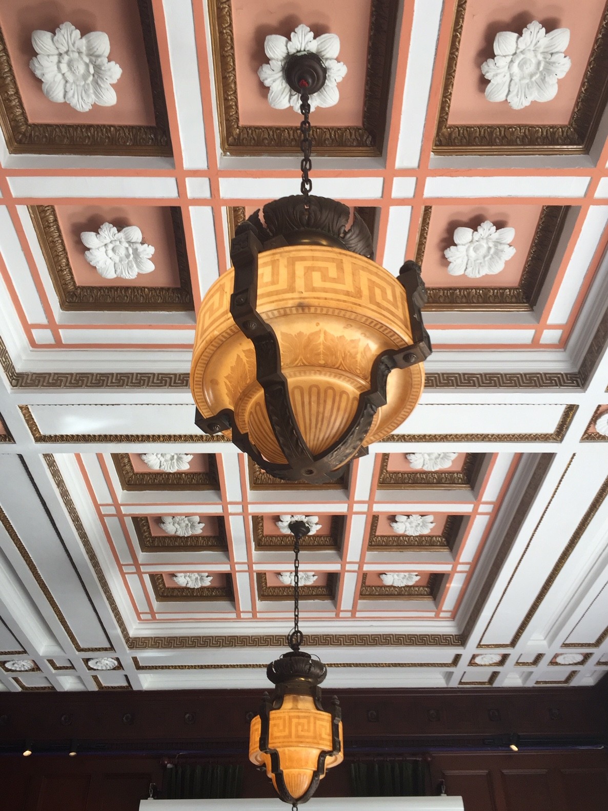 視線を上にやると、花の飾りが設置された格天井とアールデコ風のライティング・・・