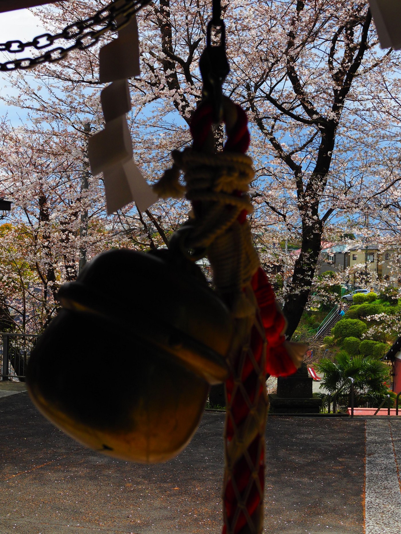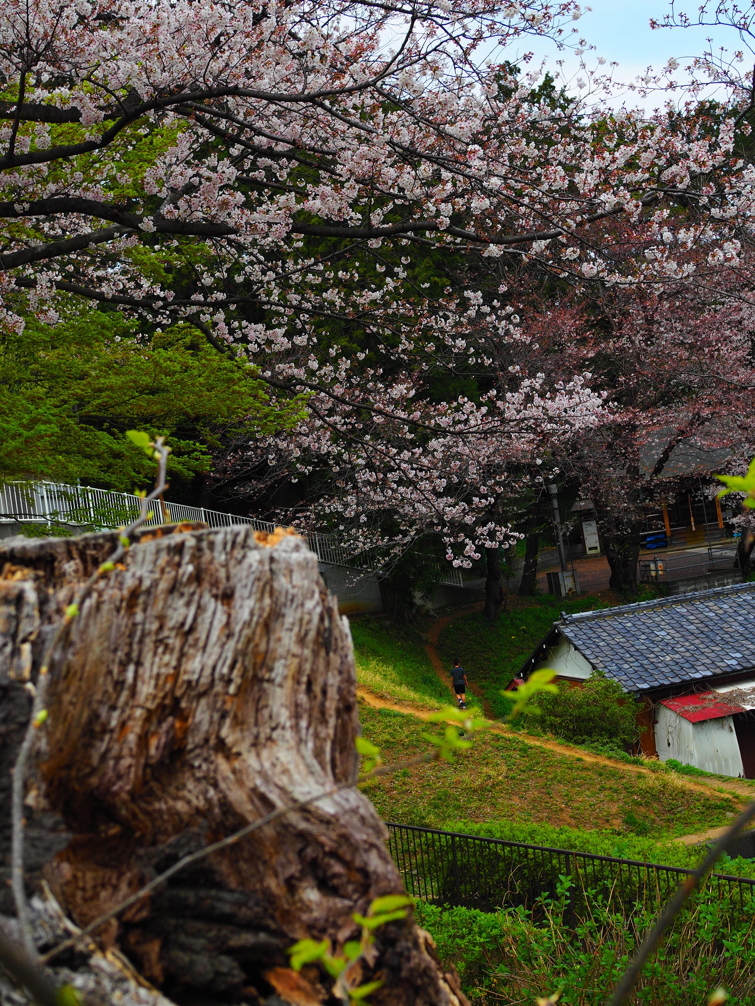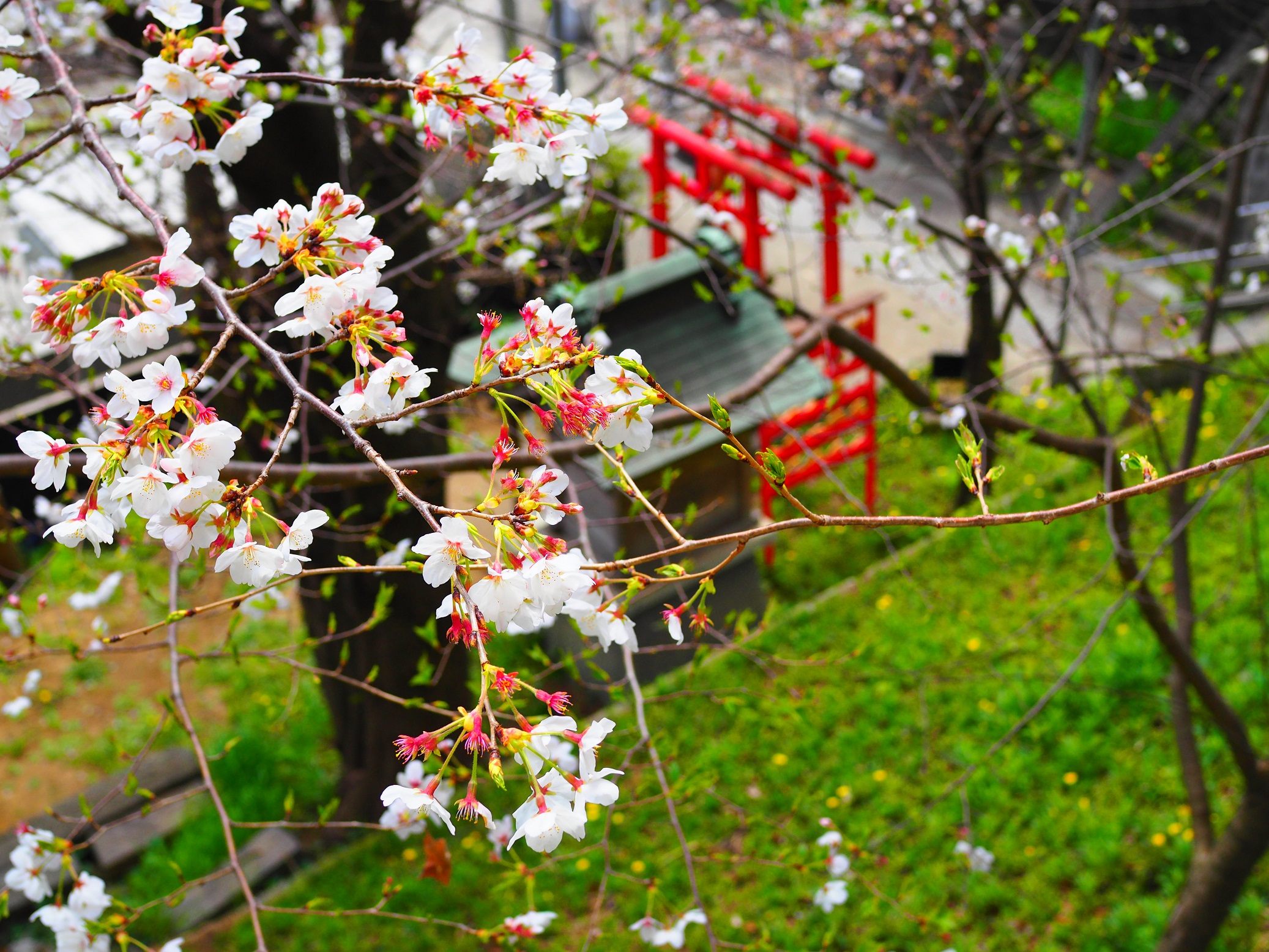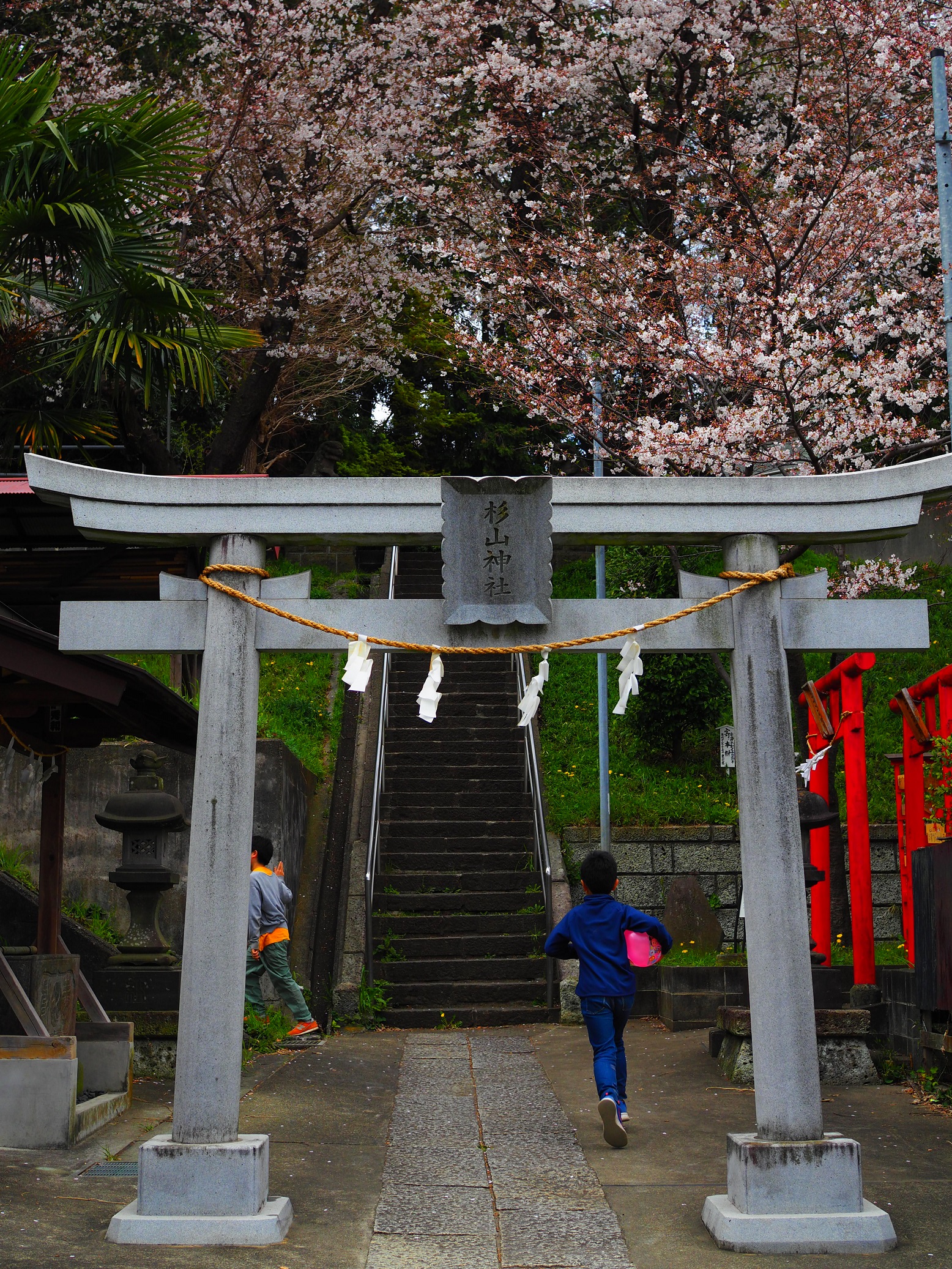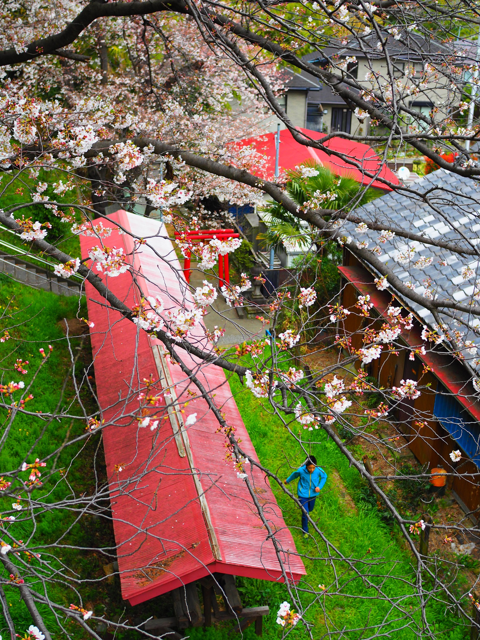 鳥居、瓦屋根、鬼ごっこの少年・・・のどかな🌸お花見ナイスです!
