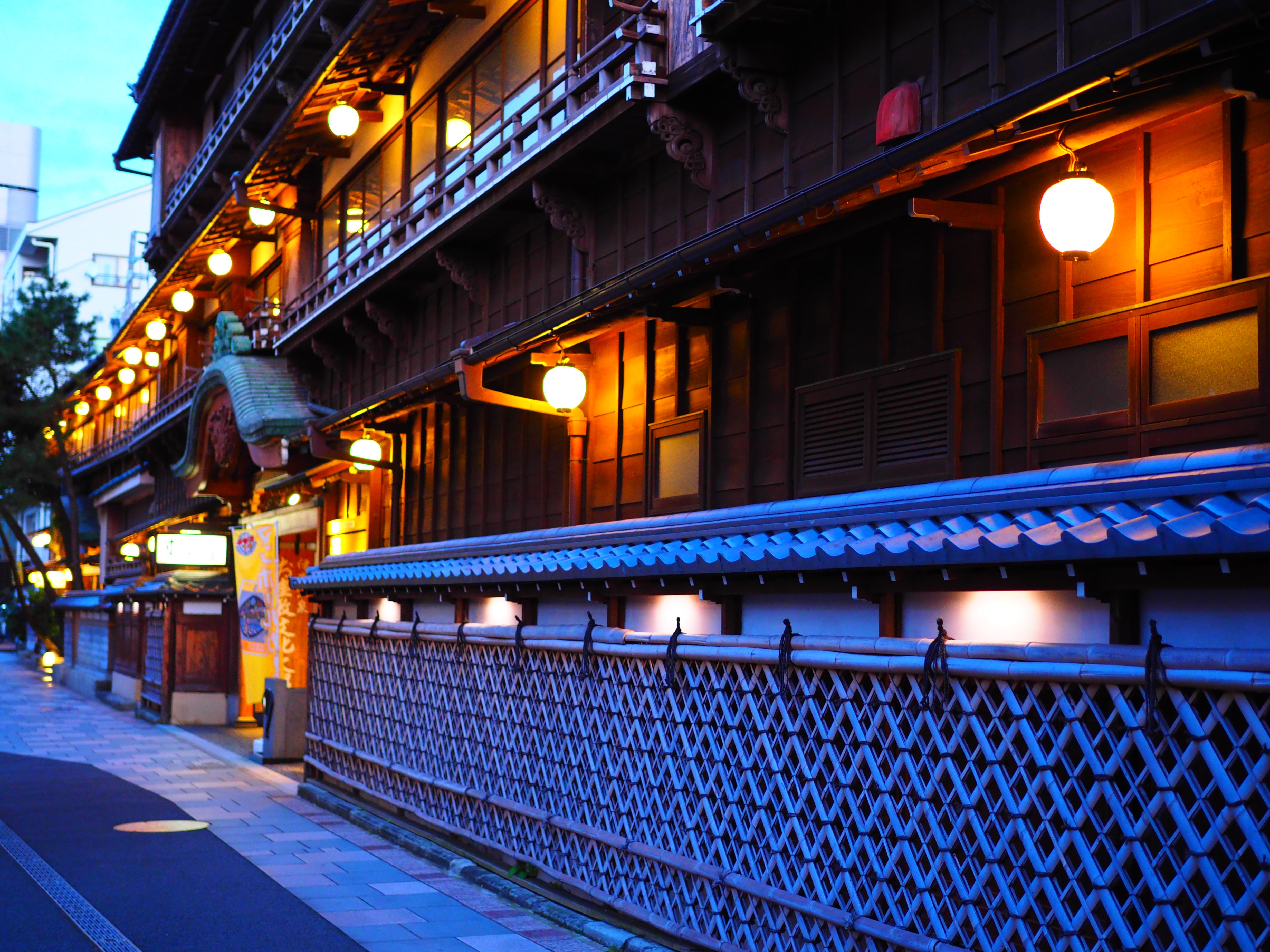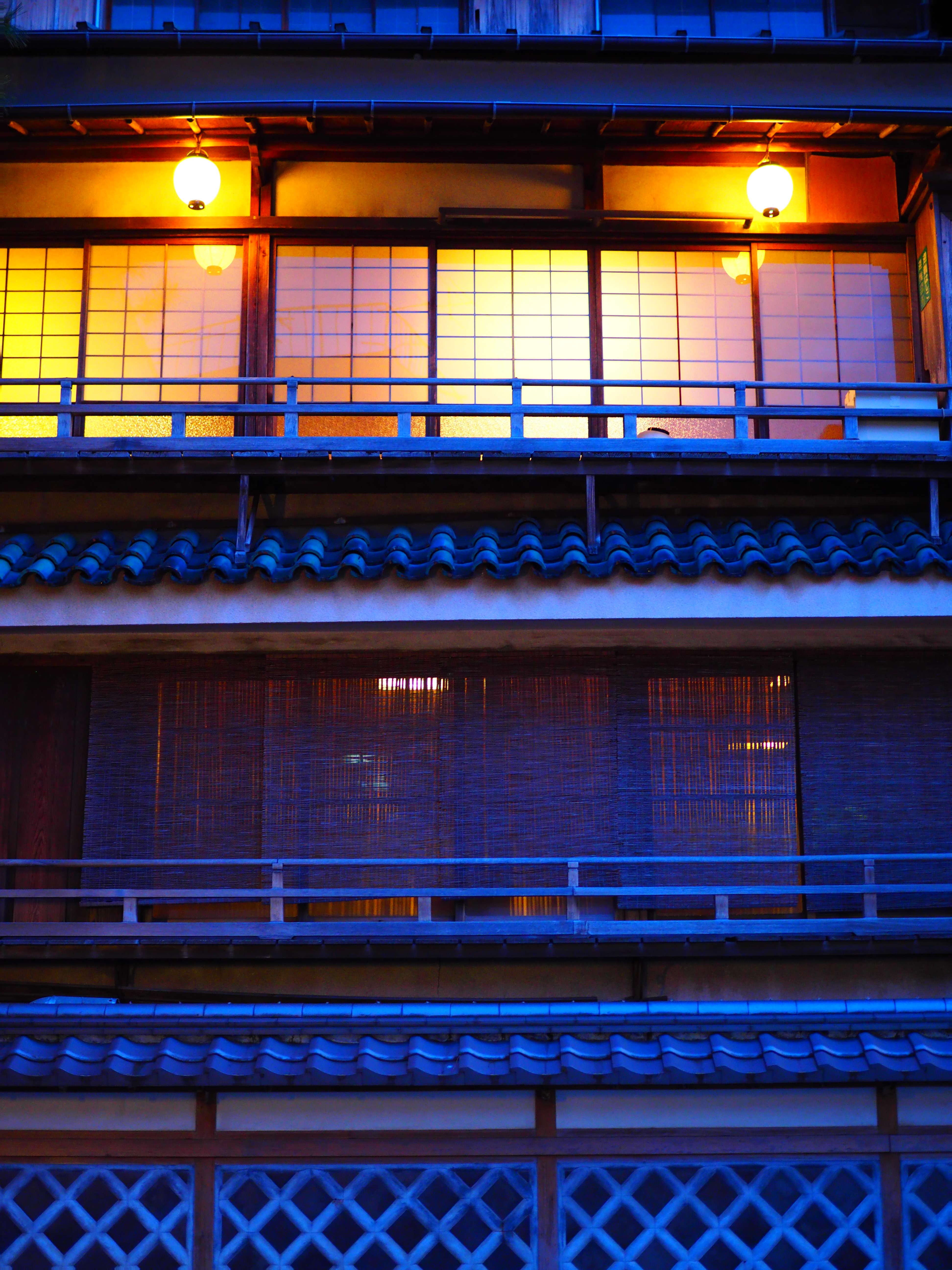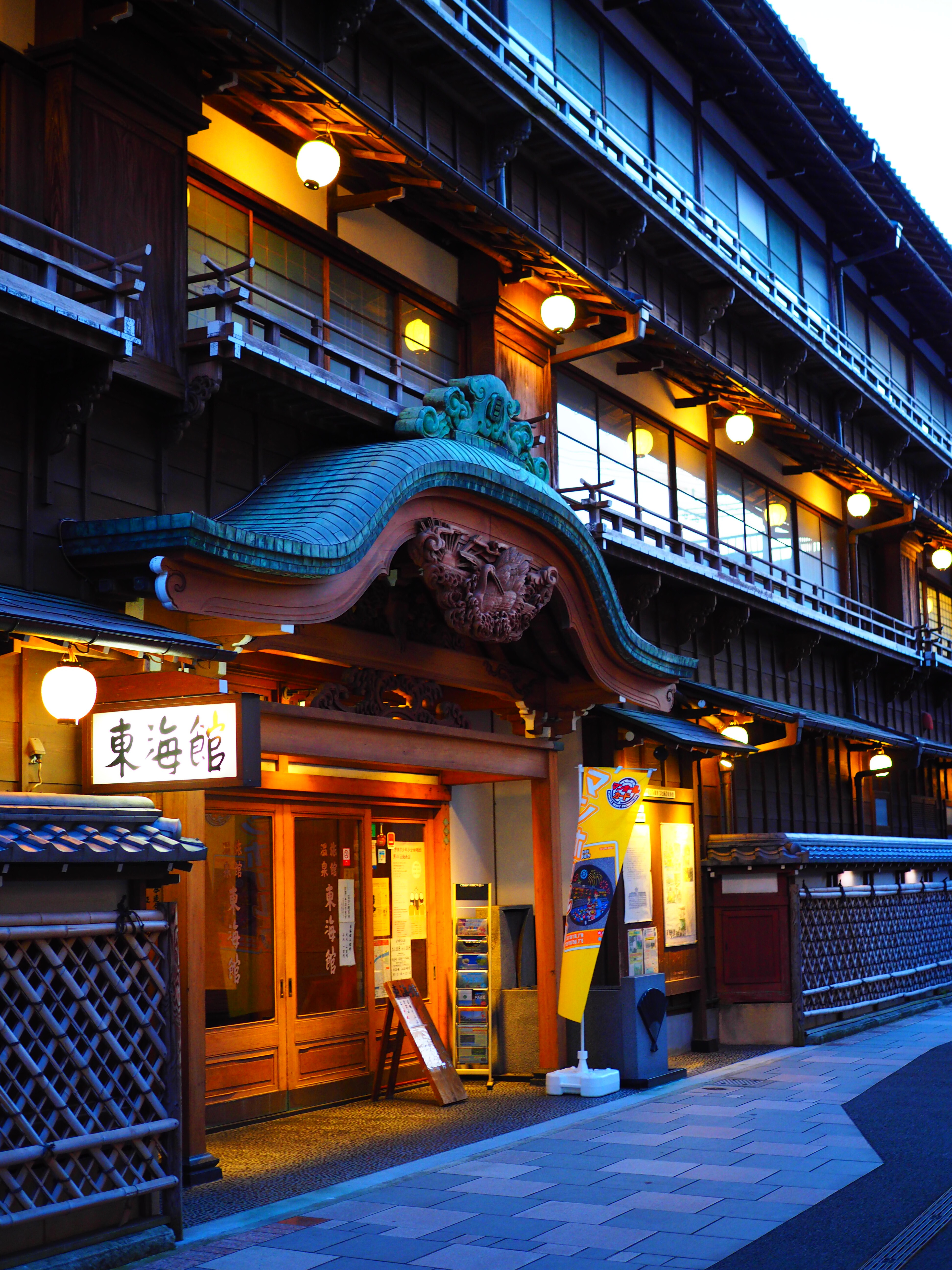 夕暮れ時の、木造三階建旅館建築・・・