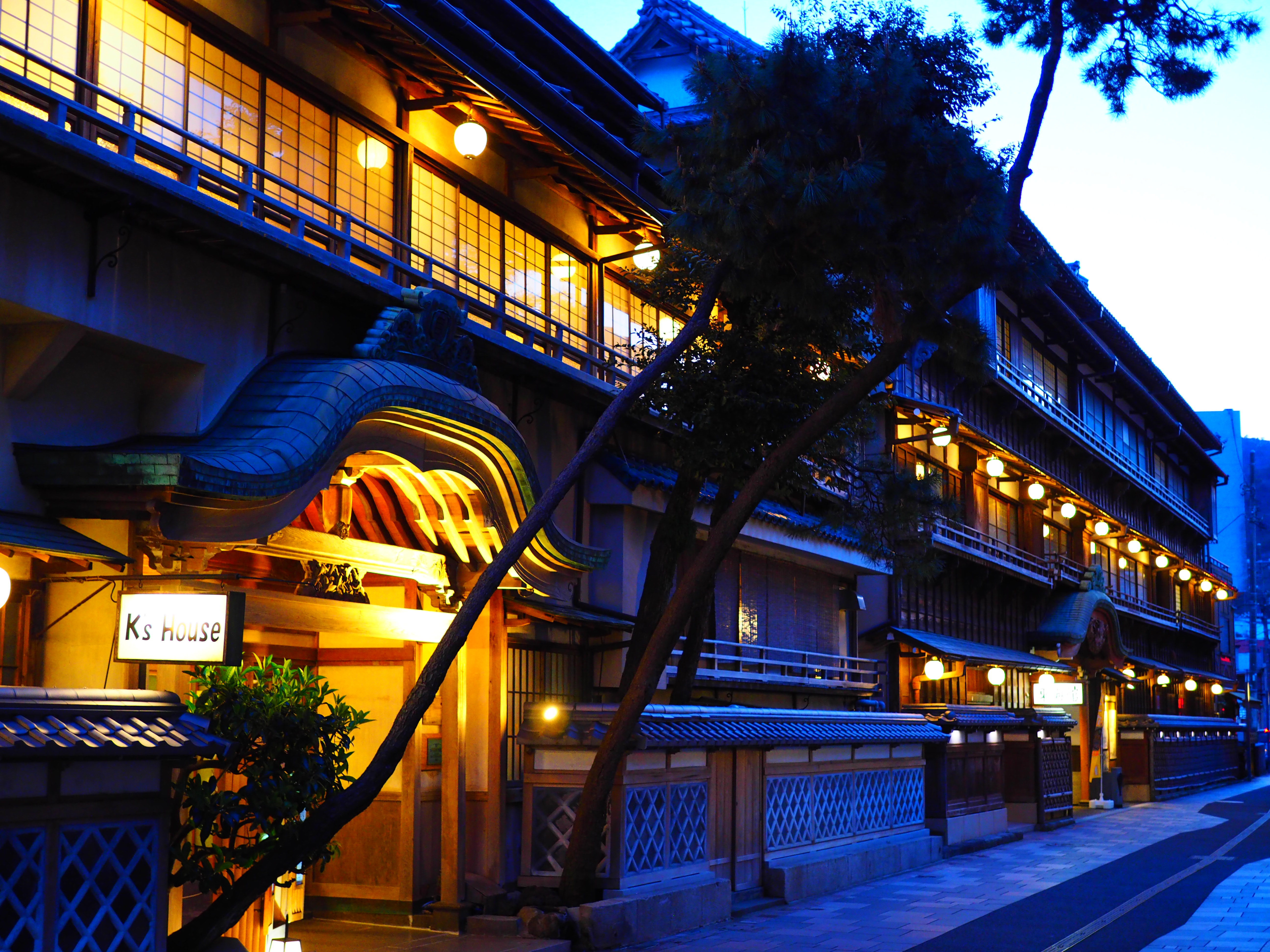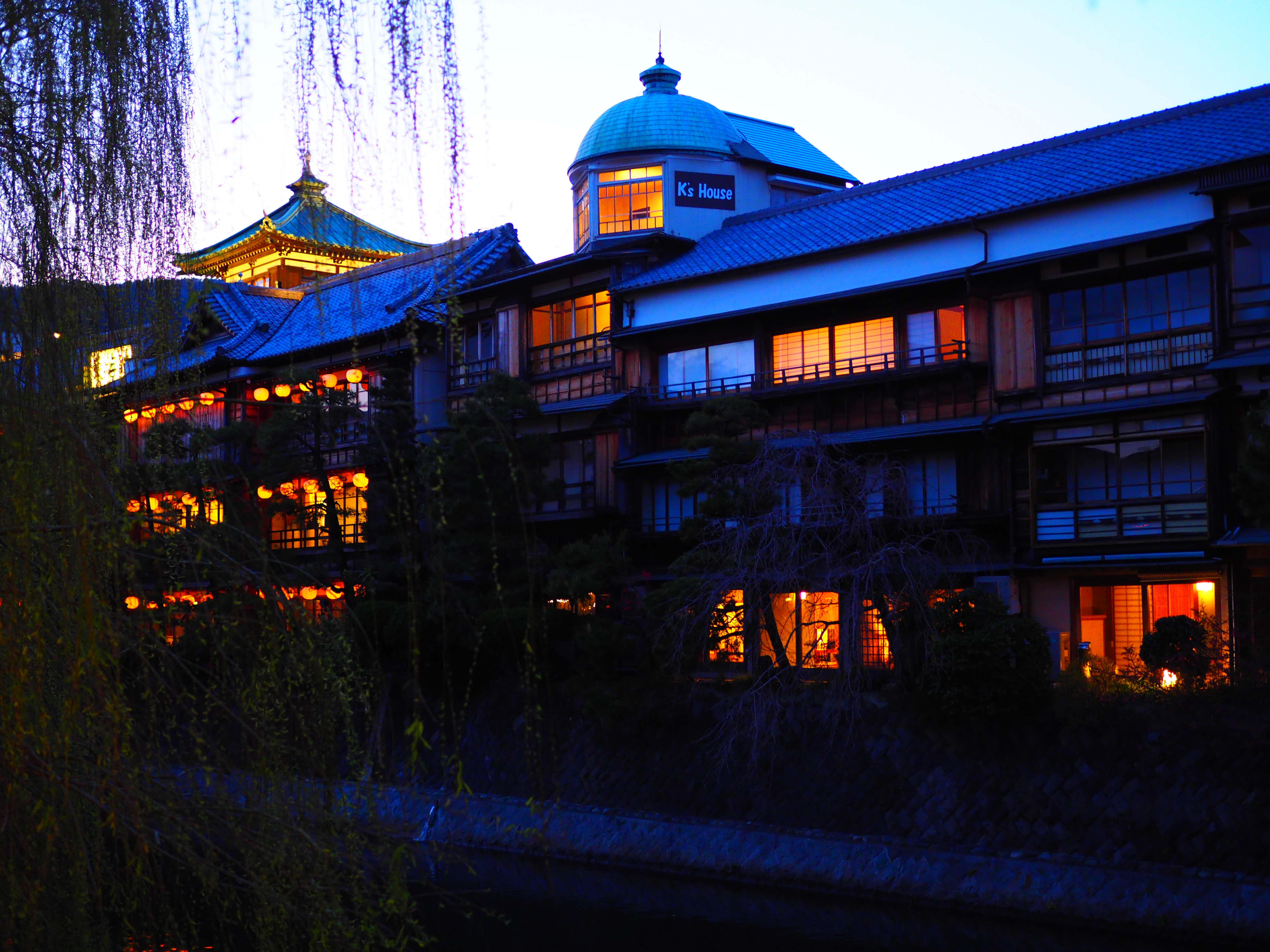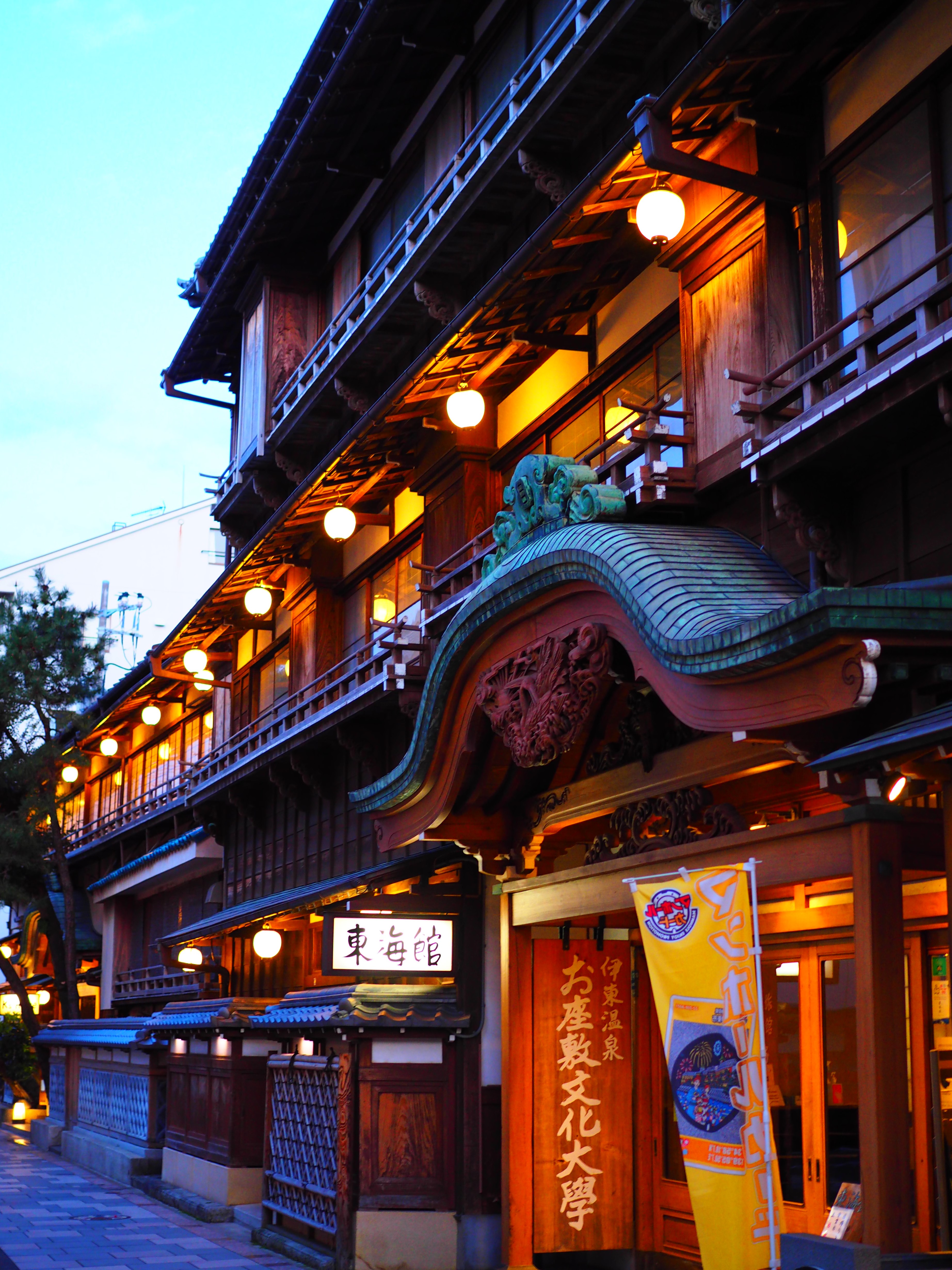 夕暮れ時の、木造三階建旅館建築・・・
