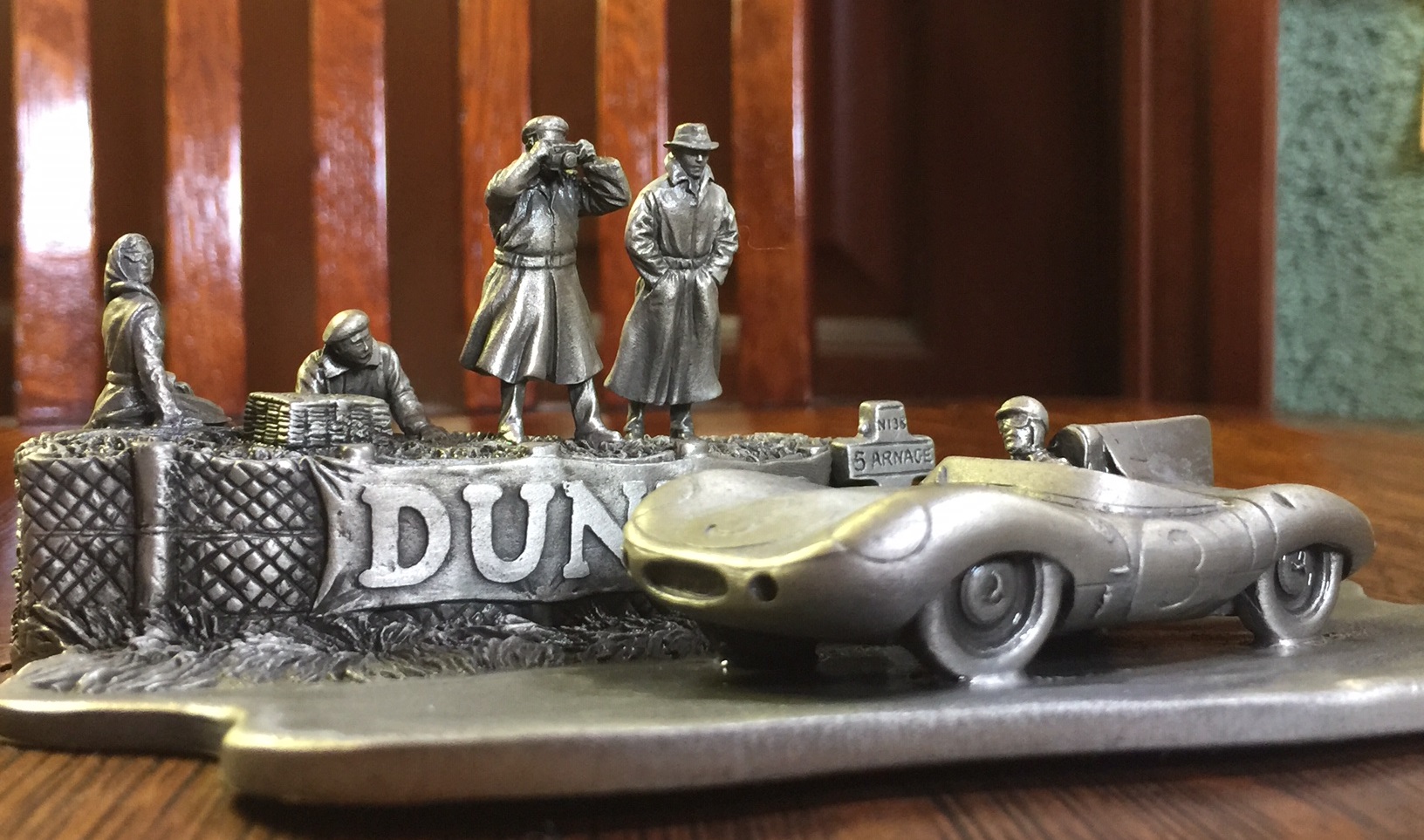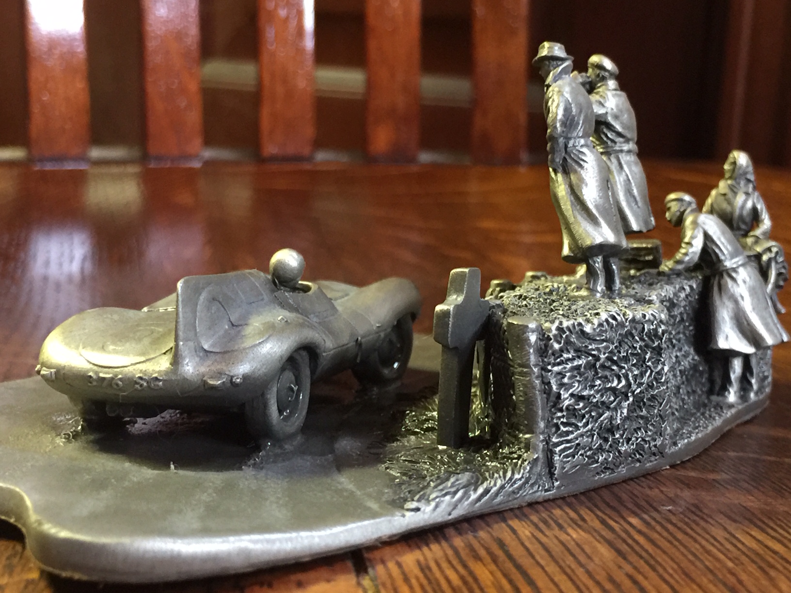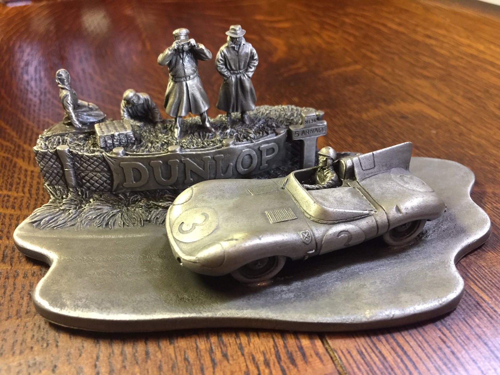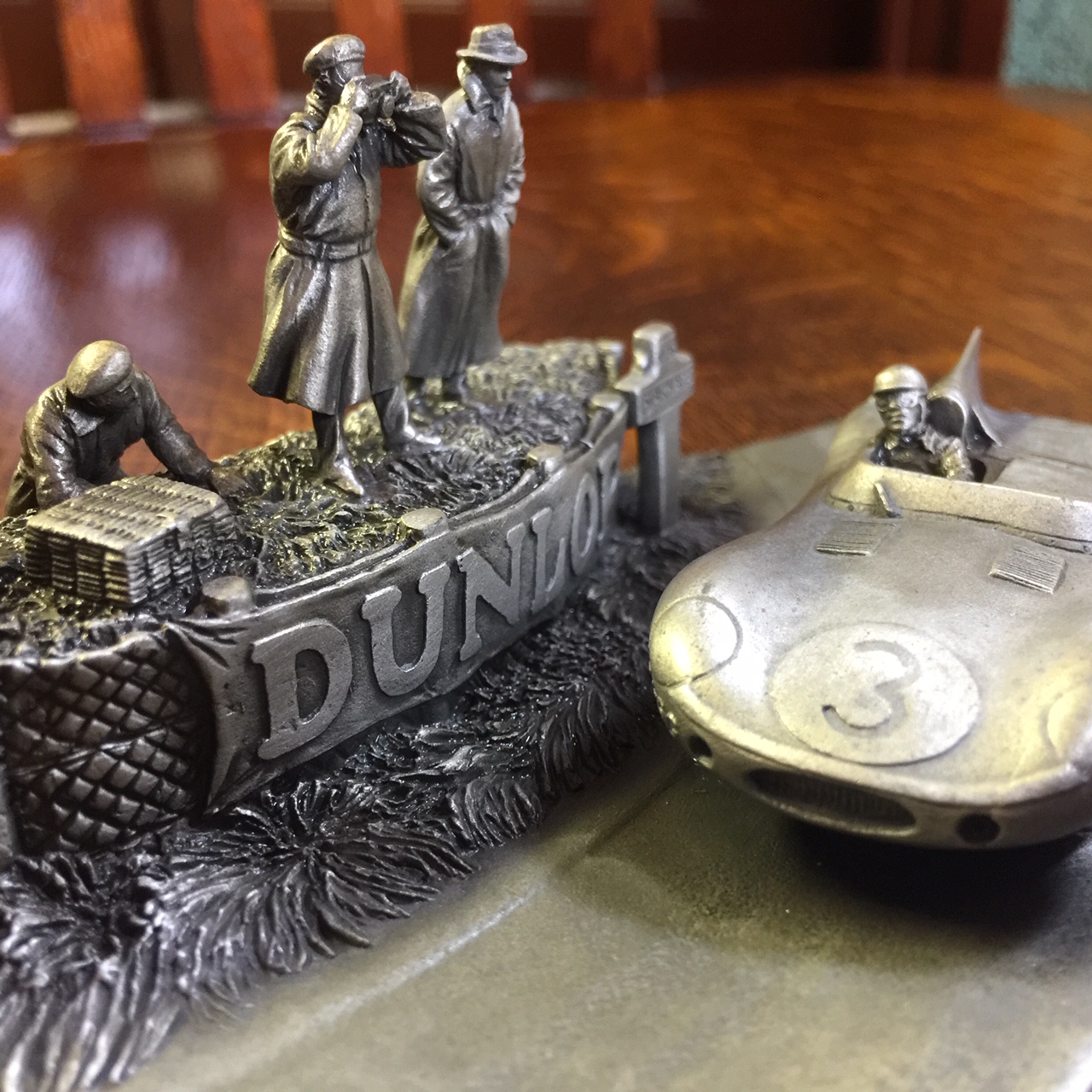 このルマンの小さなジオラマは、今から30年くらい前に英国から取り寄せたんですが、エキュリーエコッスがエントリーし、アイヴァー・ビューブ / ロン・フロックハートのコンビで1957年のルマン24時間レースを制したジャガーD-TYPEがDUNLOPの垂れ幕が掲げられたコーナーを通過していくシーンを表現しています。