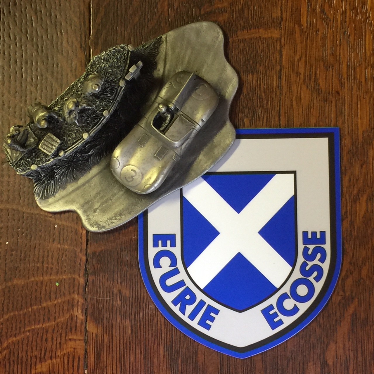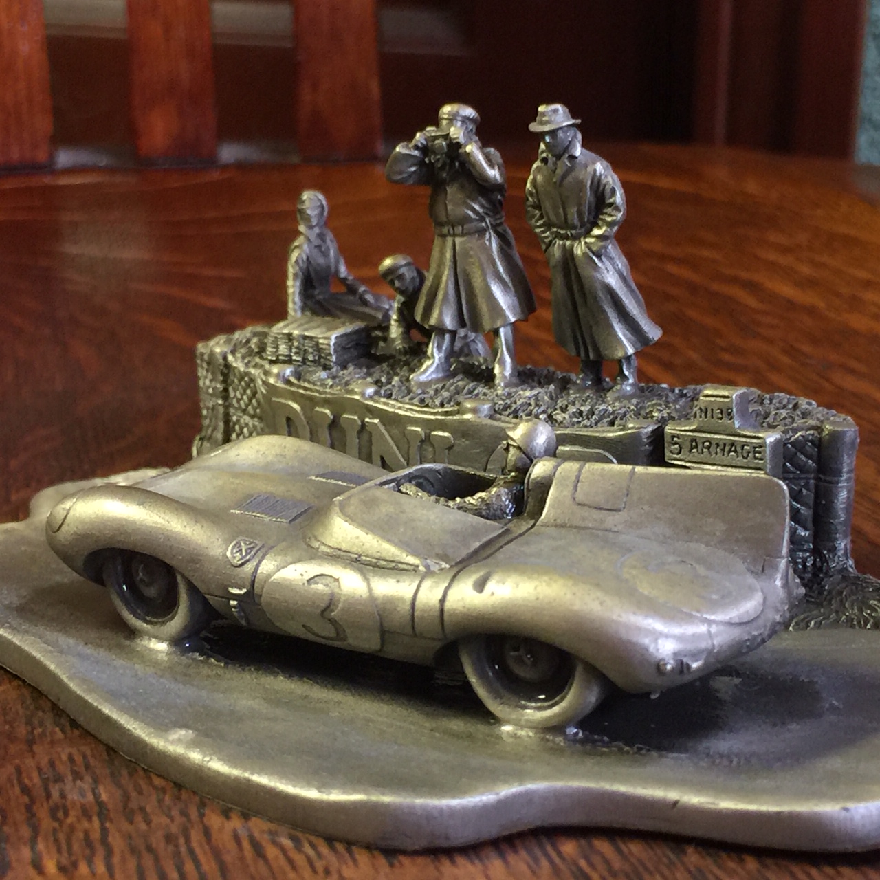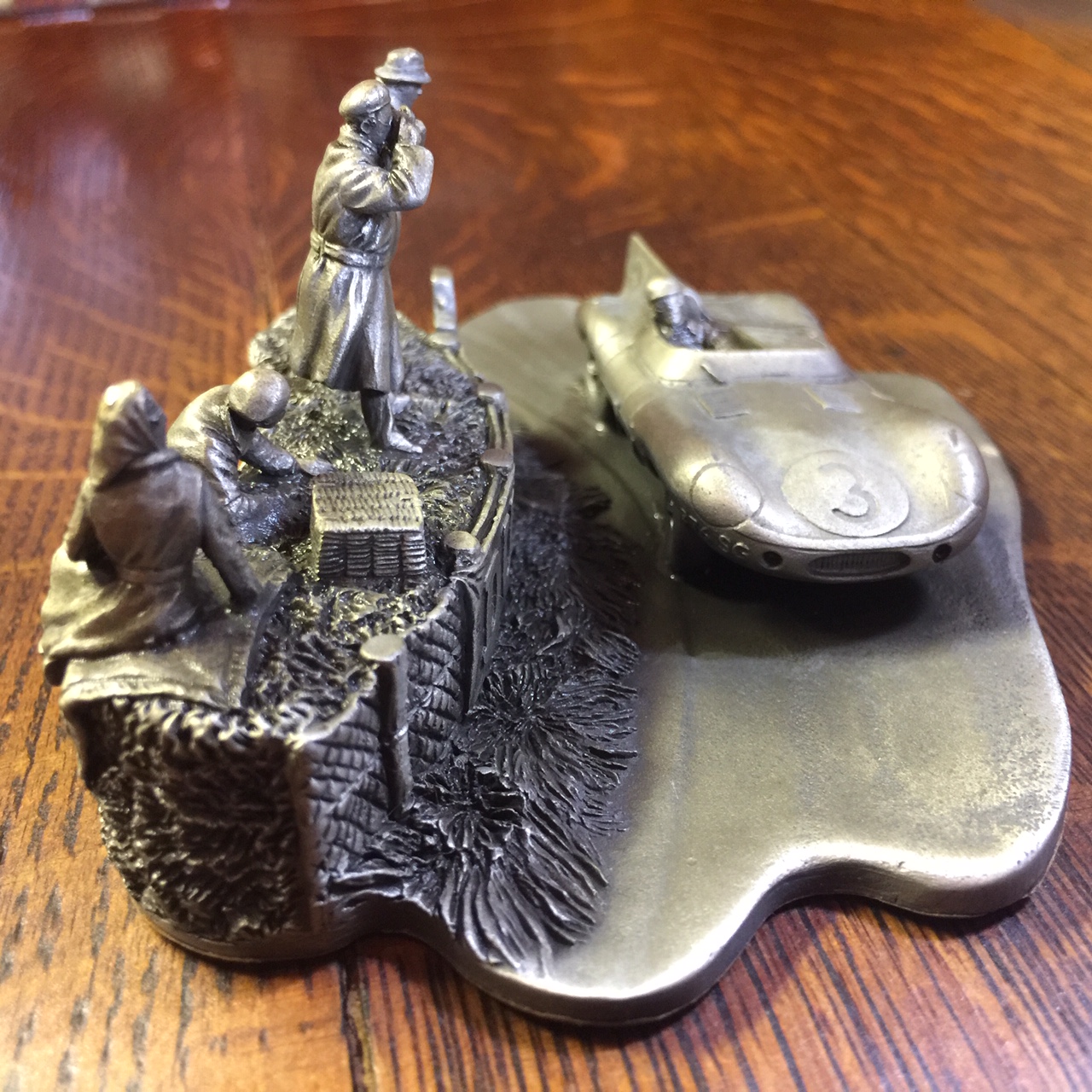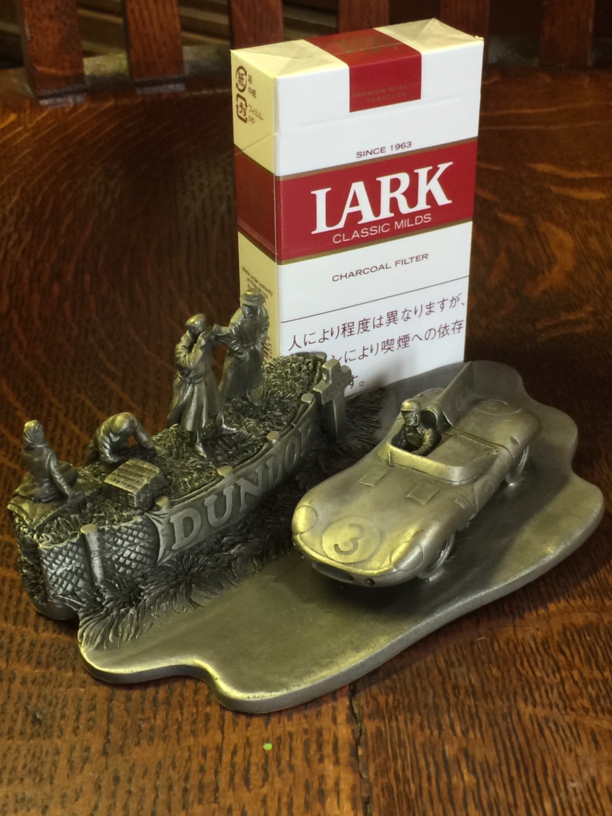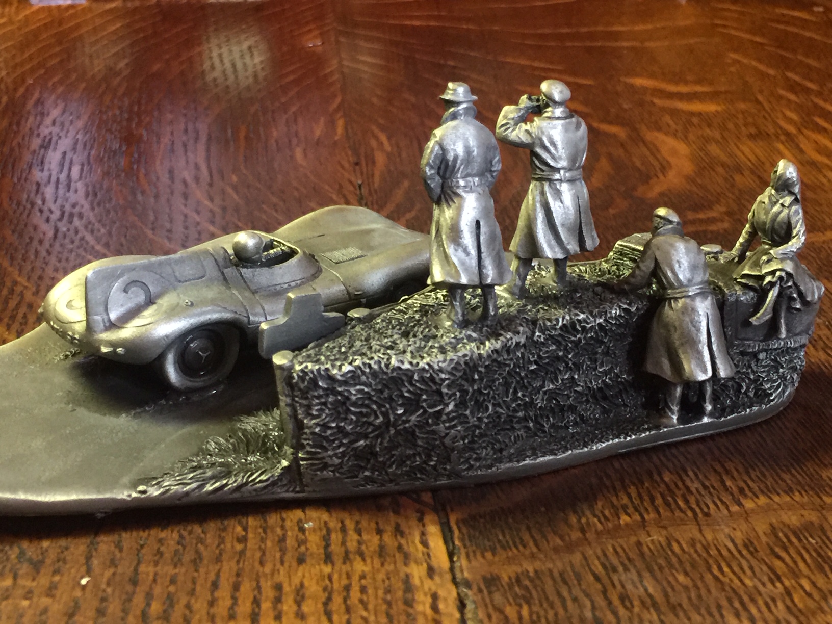このルマンの小さなジオラマは、今から30年くらい前に英国から取り寄せたんですが、エキュリーエコッスがエントリーし、アイヴァー・ビューブ / ロン・フロックハートのコンビで1957年のルマン24時間レースを制したジャガーD-TYPEがDUNLOPの垂れ幕が掲げられたコーナーを通過していくシーンを表現しています。